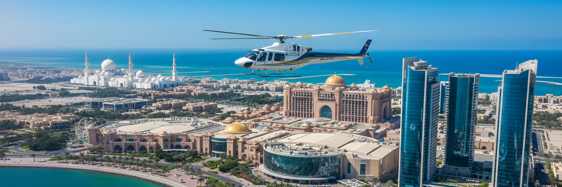 Our professional pilots make sure your helicopter ride Abu Dhabi is smooth and safe while sharing interesting insights about each attraction below. From the glittering Corniche to the stunning Emirates Palace and the white domes of Sheikh Zayed Grand Mosque, every moment in the air will leave you amazed. Fly over the turquoise waters, golden islands, and the city’s architectural wonders for an unforgettable experience that captures Abu Dhabi’s true beauty.